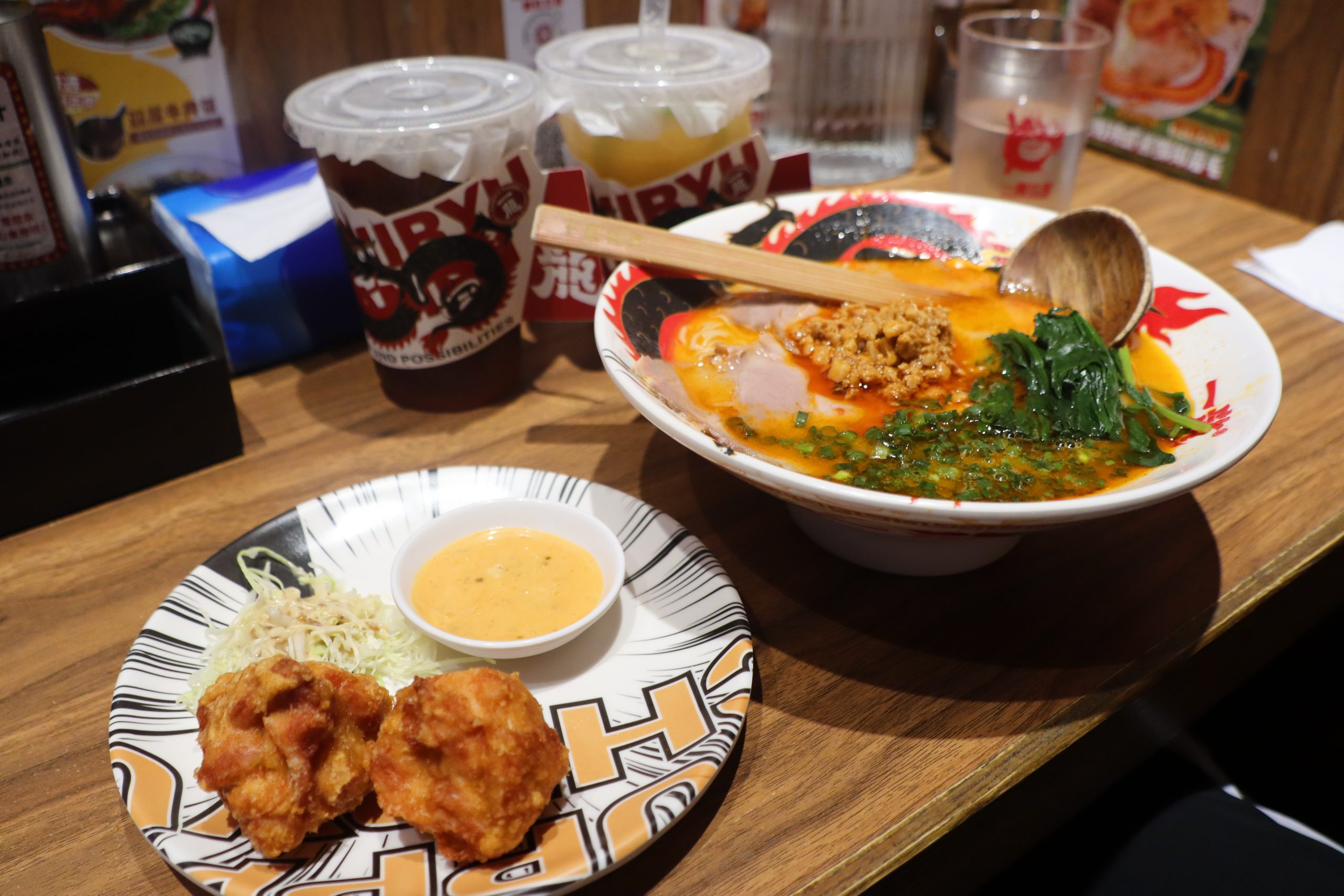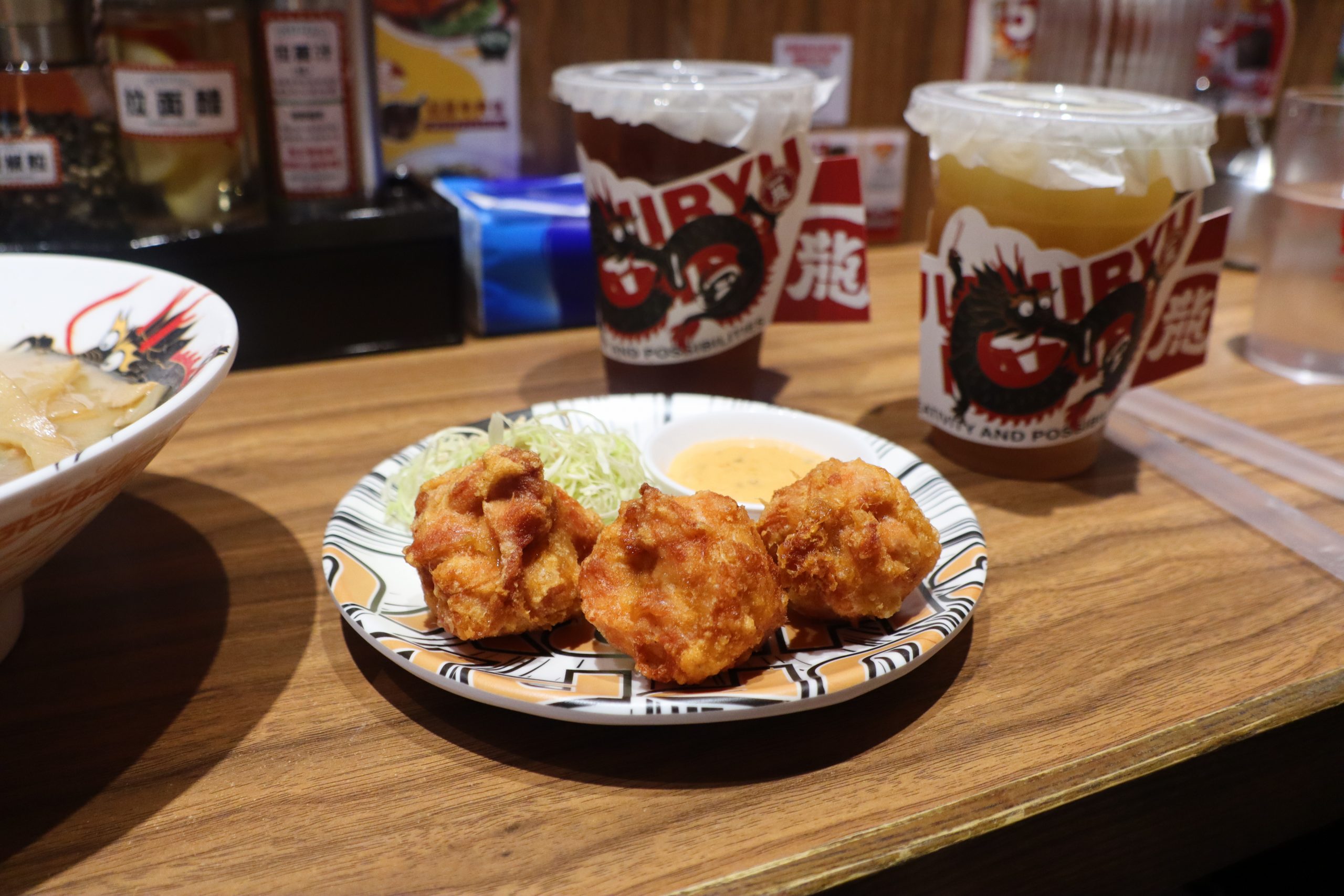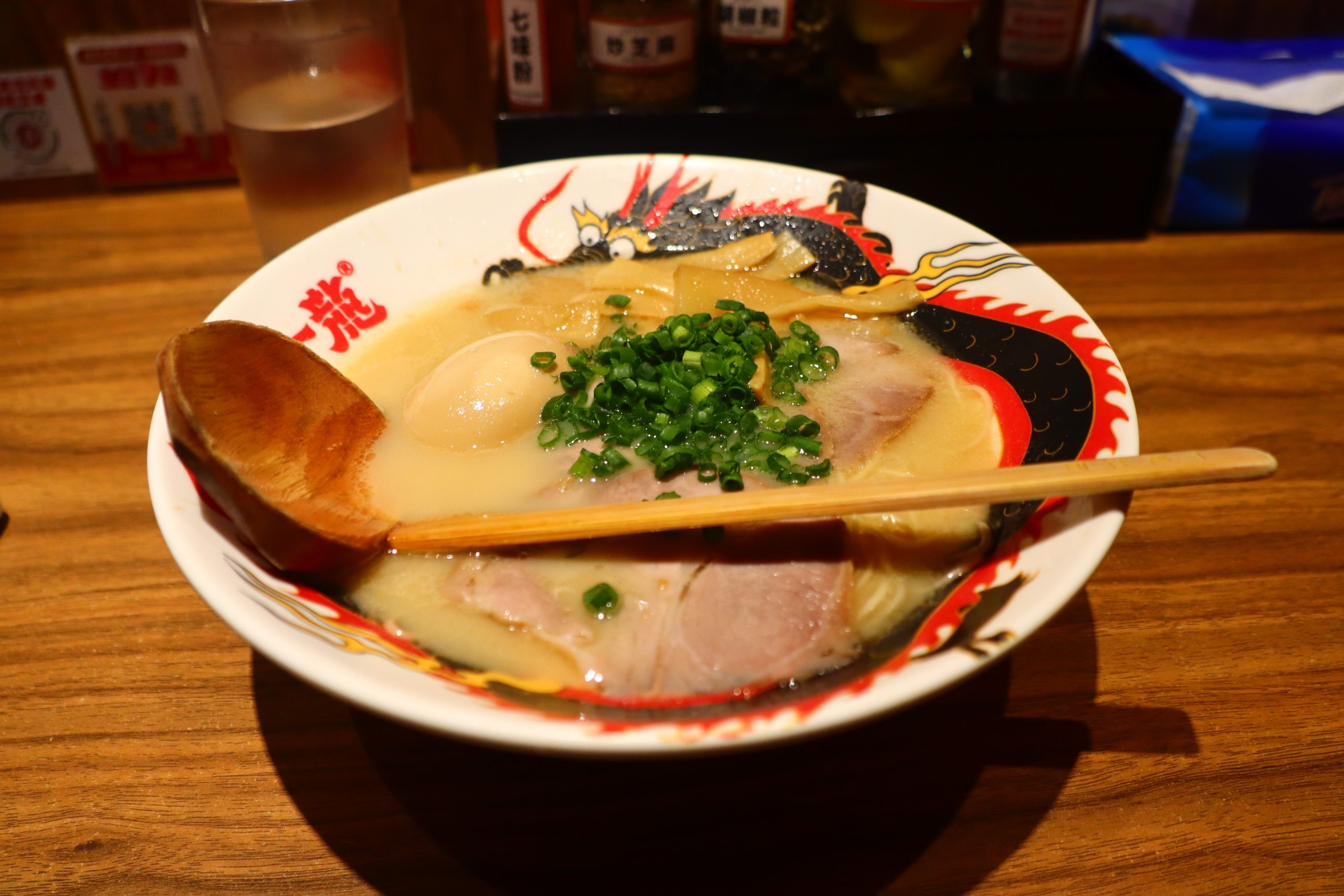 一龙拉面在天河城的6楼(还是5楼来着?),是一家日式连锁拉面面馆,虽然说是日式连锁,但我感觉装潢上并不日式,“一龍”两大字招牌倒挺醒目的,店内空间不算太大,座位大致呈T字形,人气较为火爆(中午12点饭点了),我们两人12点半取号也排了将近半小时才入座。我在美团上购买了118的团购券(两份拉面+两杯饮品+一份炸鸡),扫码很快就点好了餐。我选择的是招牌的拉面,因为前几次探日式拉面店都是吃的较为重口的黑拉面(其实就是加了致死量的黑芝麻),这次就吃的清淡了点(还特地选择了清淡一点的汤底),也算换换口味了。